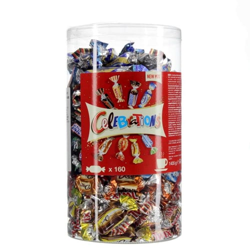 • Detta är en 1,4 kilos låda med Celebrations. Dessa läckra chokladbitar är perfekta att dela med sig av vid festliga tillfällen eller bara som lite lyx i vardagen. Celebrations innehåller en blandning av olika chokladmärken som Mars, Snickers och Twix. De är tillverkade av ingredienser som socker, kakaosmör, skummjölkspulver och en mängd andra läckra saker. Observera att produkten kan innehålla nötter och gluten.